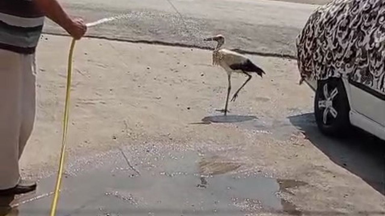 Bursa’nın İnegöl ilçesinde sıcak havalardan bunalan bir leylek, bir evin önüne inerek gölgeye sığındı. Ev sahibi ise durumu fark edince hortumla leyleği ıslatarak serinletti.