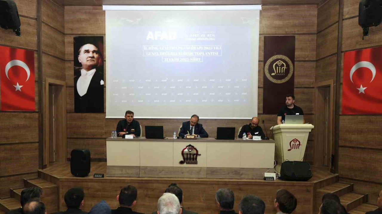 Siirt İl Afet Risk Azaltma Planı (İRAP) 2025 Yılı Genel Değerlendirme Toplantısı, Vali Kemal Kızılkaya başkanlığında gerçekleştirilerek 52 eylem planı masaya yatırıldı.