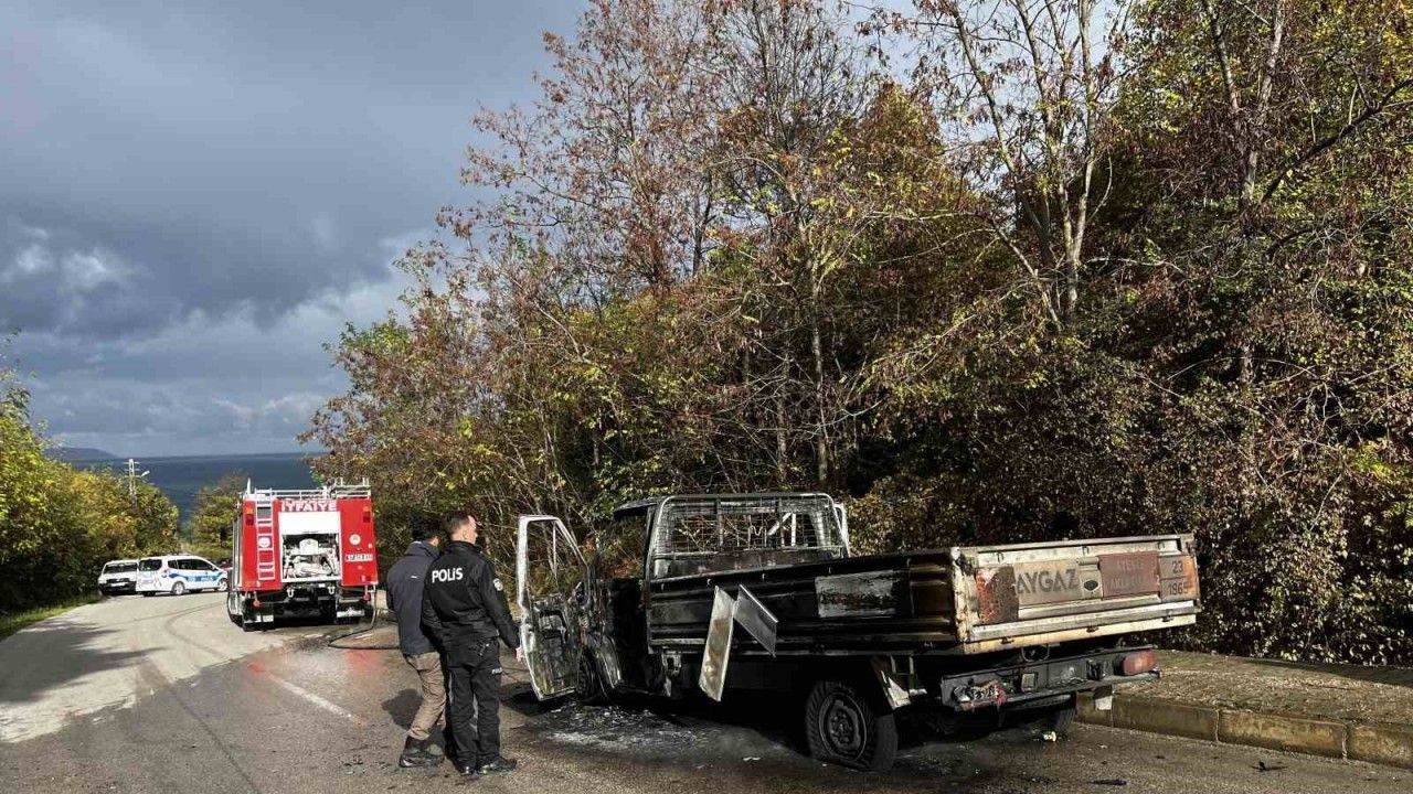 Sinop’un Gerze ilçesinde seyir halindeyken yanmaya başlayan kamyonet alevlere teslim oldu.