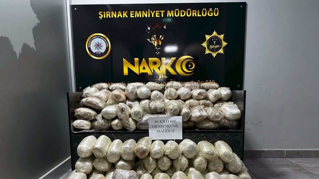 Şırnak’ta polis ekiplerince durdurulan araçta 86 kilo 600 gram skunk ele geçirildi. Uyuşturucuyla ilgili 3 şüpheli gözaltına alındı.