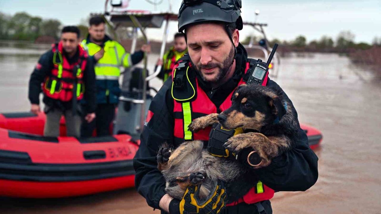 Bursa'nın Karacabey ilçesinde meydana gelen su taşkınında bağ evinde mahsur kalan 2 köpek, Bursa Büyükşehir Belediyesi ekiplerinin başarılı operasyonu ile kurtarıldı.