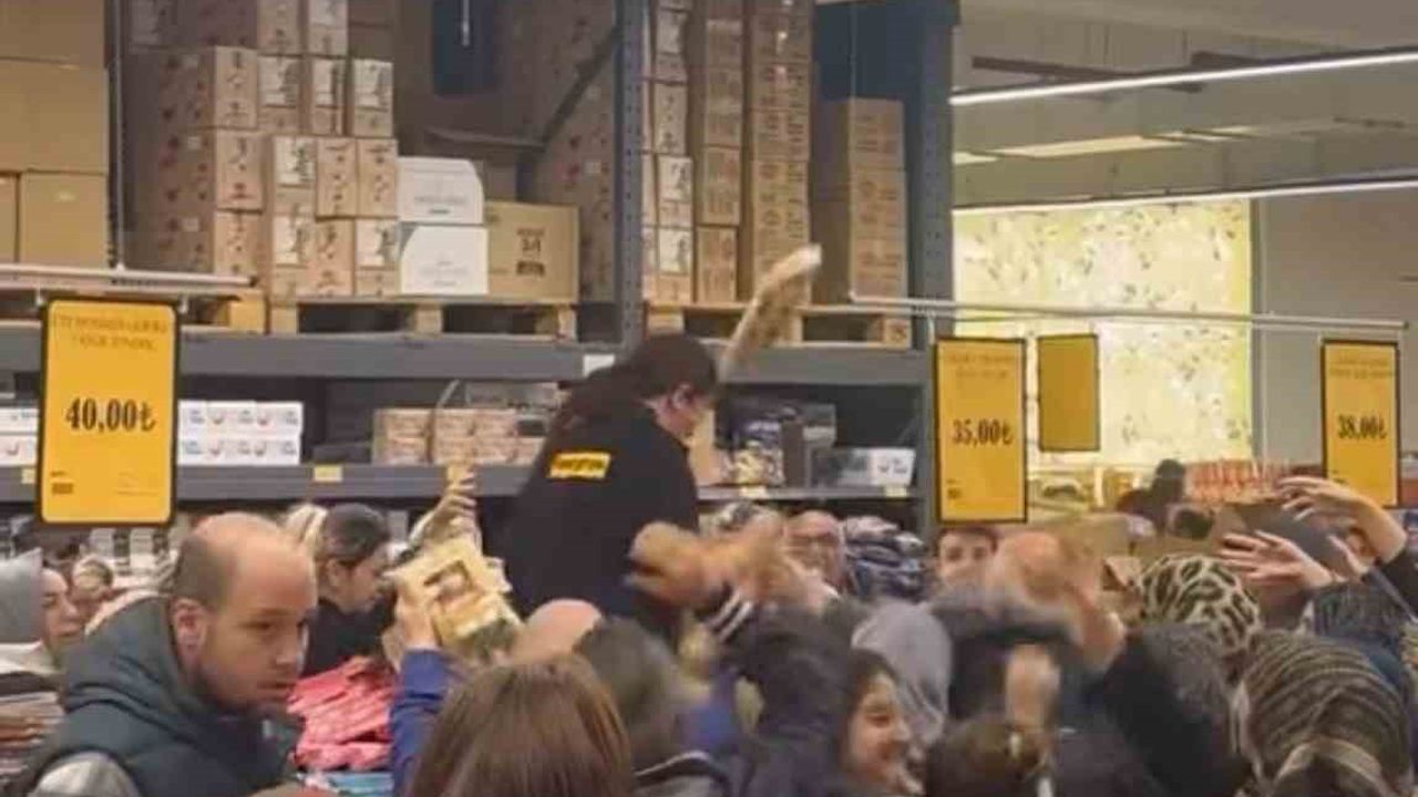 Bursa’nın Nilüfer ilçesinde bir süpermarkette yapılan indirim kampanyası, izdihama neden oldu. Çalışanların indirimli ürünleri vatandaşlara fırlattığı görüldü.