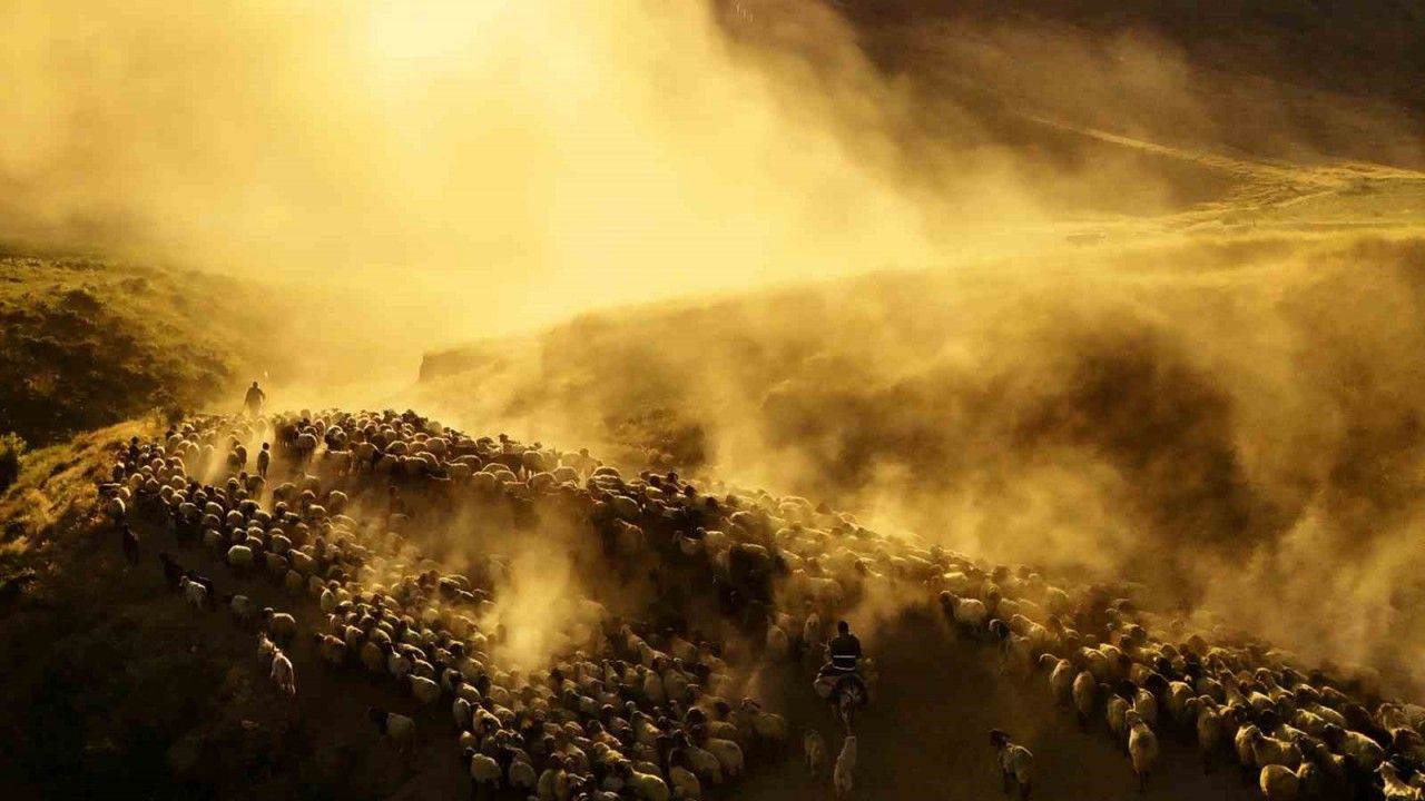Bitlis’in Tatvan ilçesine bağlı Kıyıdüzü köyündeki koyun sürülerinin tozlu vadideki yolculukları havadan görüntülendi.