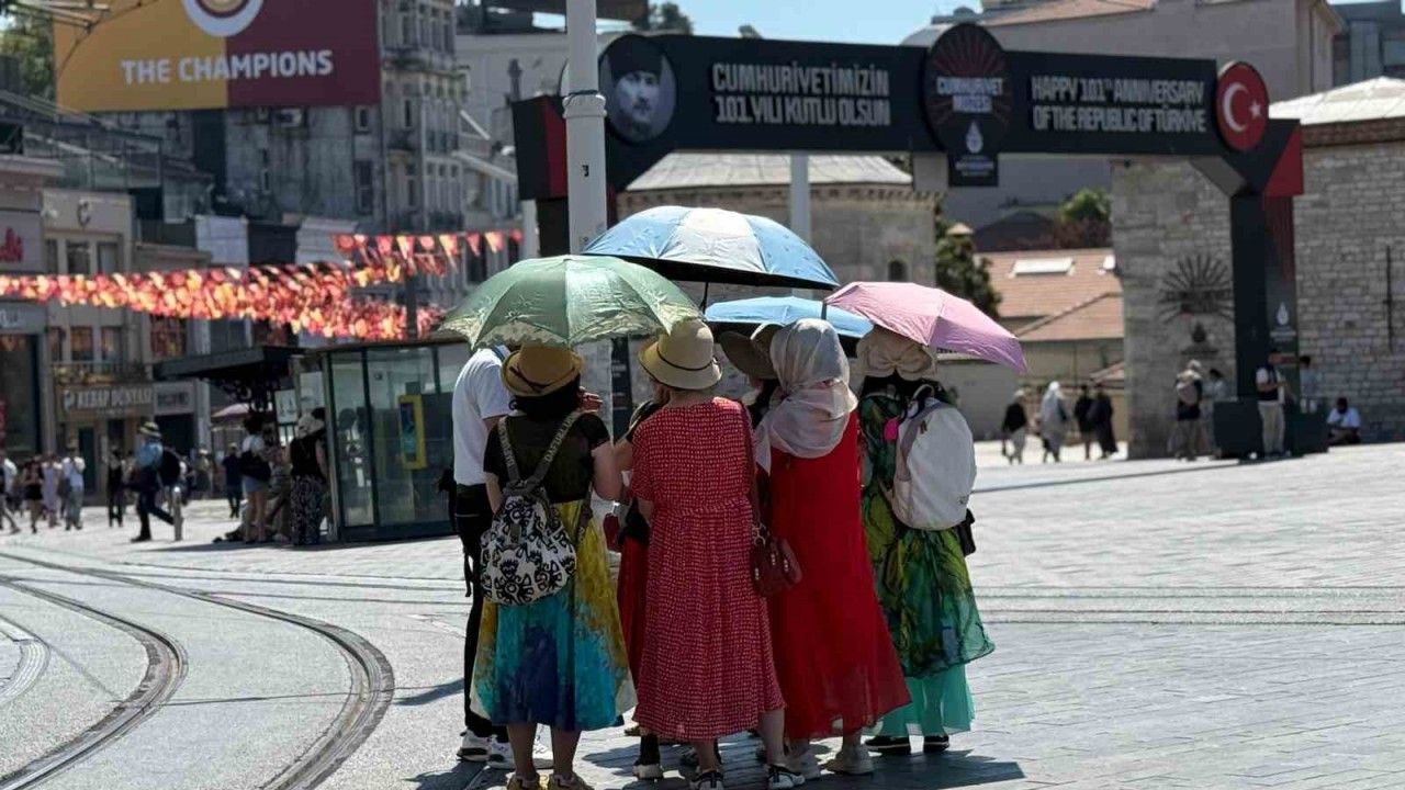 İstanbul’da etkili olan sıcak hava, vatandaşları bunalttı. Taksim Meydanı’nda kimisi şemsiyle gezerken, kimisi ise gölgelik alanlarda serinlemeye çalıştı.
