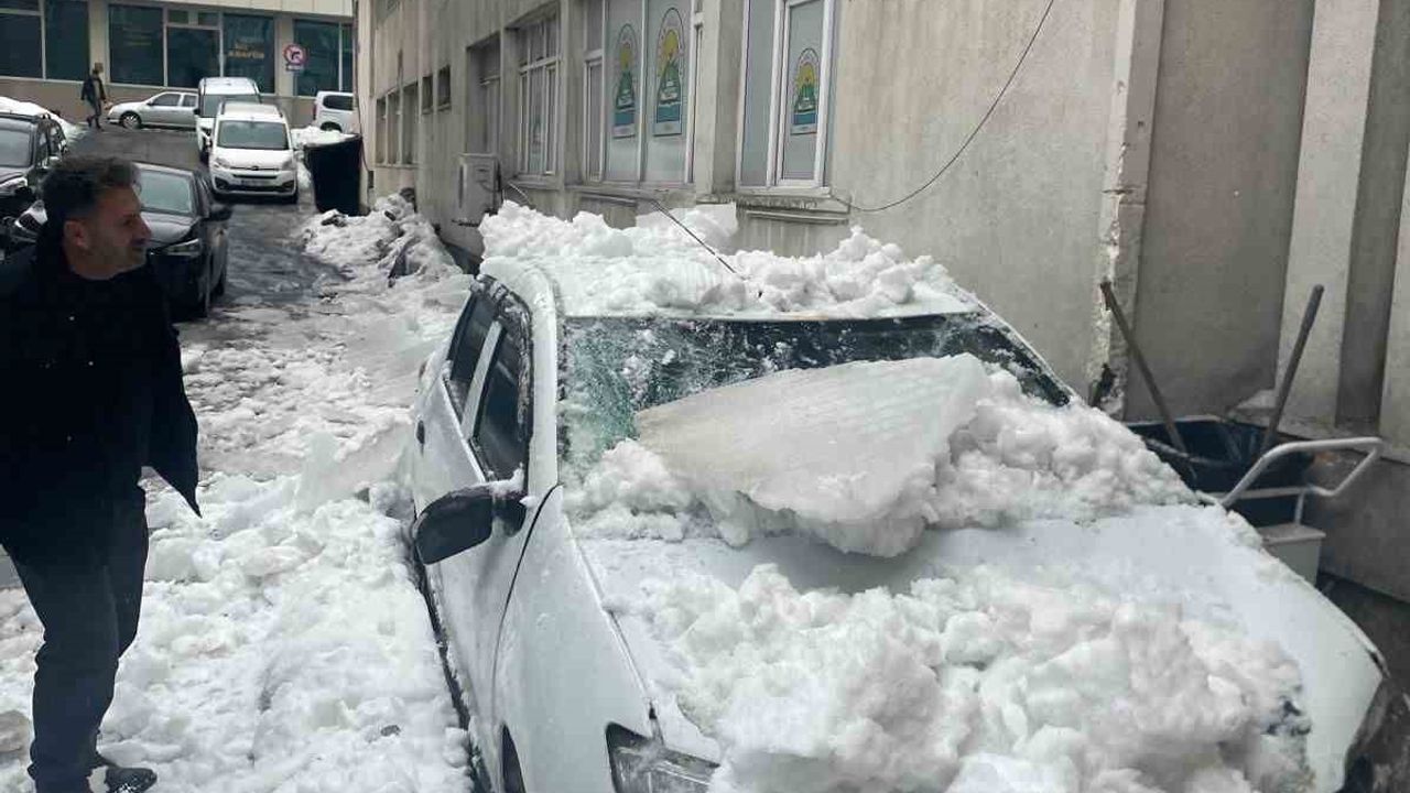 Bitlis'in Tatvan ilçesinde çatısında biriken kar kütlelerinin düşmesi sonucu park halindeki bir otomobil araç kullanılamaz hale geldi.