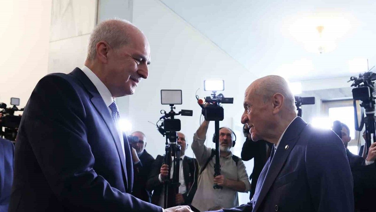 TBMM Başkanı Numan Kurtulmuş, MHP Genel Başkanı Devlet Bahçeli’yi Meclis’teki makamında ziyaret etti. Bahçeli, Kurtulmuş’u kapıda karşıladı. Basına kapalı gerçekleşen görüşmede Bahçeli’ye Meclis Başkanvekili Celal Adan, Grup Başkanvekilleri Erkan Akçay ve Filiz Kılıç eşlik etti. Yaklaşık 45 dakika süren görüşmenin ardından basın toplantısı düzenleyen Kurtulmuş, ’terörsüz Türkiye’ adı verilen süreç hakkında karşılıklı fikir alışverişinde bulunduklarını ifade ederek, "Bundan sonra sürecin nasıl işleyeceğine ilişkin fikir alışverişinde bulunduk. Özellikle İmralı’nın açıklaması, ardından terör örgütünün de bu açıklamaya uyacağını ve silah bırakmayı kabul etmesiyle Türkiye’de yeni bir süreç başlamıştır. Bu sürecin açık bir şeklide milletimizin gözü önünde ve planlanan bir şekilde sonuca ulaşabilmesi için bundan sonra TBMM’ye görev düşmektedir. TBMM’de bütün siyasi partilerin temsil edildiği bir komisyon oluşturularak, sürecin takibi, kontrolü ve öncülük edilmesi gerekecek. Bu sürecin ilerlemesi yönünde fikirlerimizi paylaştık. Ümit ediyorum ki önümüzdeki sürecin de TBMM’nin bu tarihi sorumluluğu yerine getirerek en güzel sonuçlandırması nasip olsun. Dünya siyasetinin büyük değişimler yaşadığı hem de bölge siyasetinin baştan aşağı şekillendiği bu dönemde Türkiye’nin önüne tarihi bir fırsat geçmiştir. Bu fırsat siyaset üstü bir sorumluluk gerektirmektedir. Bu süreç herhangi bir siyasi partinin ortaya koyabileceği tek başına gerçekleştirebileceği bir siyasi süreç değildir. Bu bir al ver meselesi de değildir. Gönüllü bir şekilde birlik beraberlik sürecinin tesis edilmesidir. Bunun için ümit ediyorum ki herkes sorumlu bir şekilde elini taşın altına koyarak üzerine düşen sorumlulukları yerine getirir. TBMM’nin kontrolünde ve müzakere ortamında bu konu tamamı ile gerçekleşmiş olur" ifadelerini kullandı.