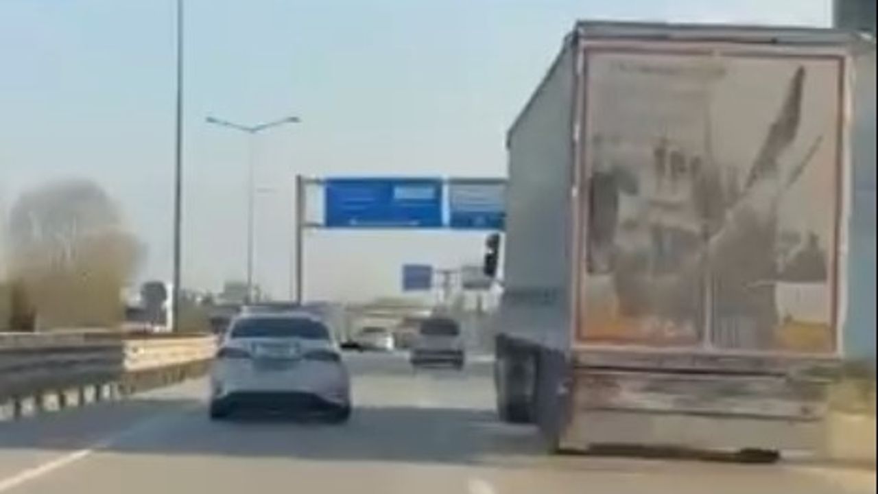 Bursa'nın İnegöl ilçesinde dur ihtarına uymayan TIR'ın sürücüsü bölge trafik ekipleri tarafından silah doğrultarak durduruldu. Kovalamaca başka bir sürücünün amatör kamerasına yansıdı.