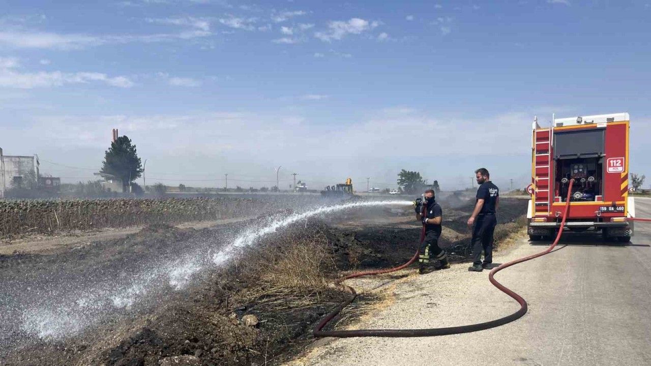 Hayrabolu ilçesi Alpullu Caddesi çevre yolu üzerinde yol kenarında bulunan gübrelerin henüz bilinmeyen bir sebeple yol kenarındaki hayvan gübresinin tutuşması sonucu yangın çıktı.