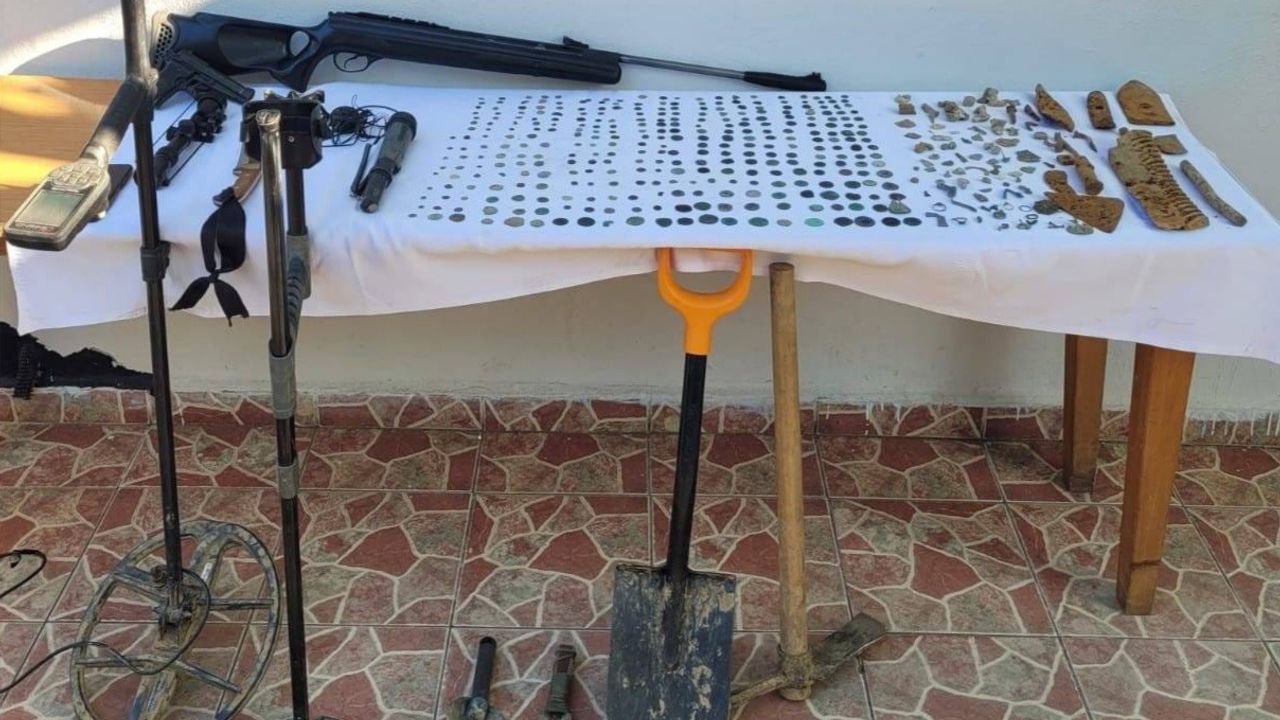Ayrıca, 1 adet cep telefonu, 3 adet dedektör, 432 adet tarihi eser niteliğinde obje ve sikke, 1 adet tahkim edevat kürek, 1 adet kazma, 2 adet el küreği, 1 adet dürbün, 1 adet tabanca, 7 adet tabanca fişeği, 1 adet havalı tüfek ve 1 adet kama da ele geçirilenler arasında yer aldı.