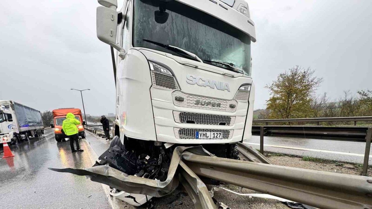 Edirne’de şiddetli sağanak nedeniyle bariyerlere çarpan tırın sürücüsü kazadan yara almadan kurtuldu.