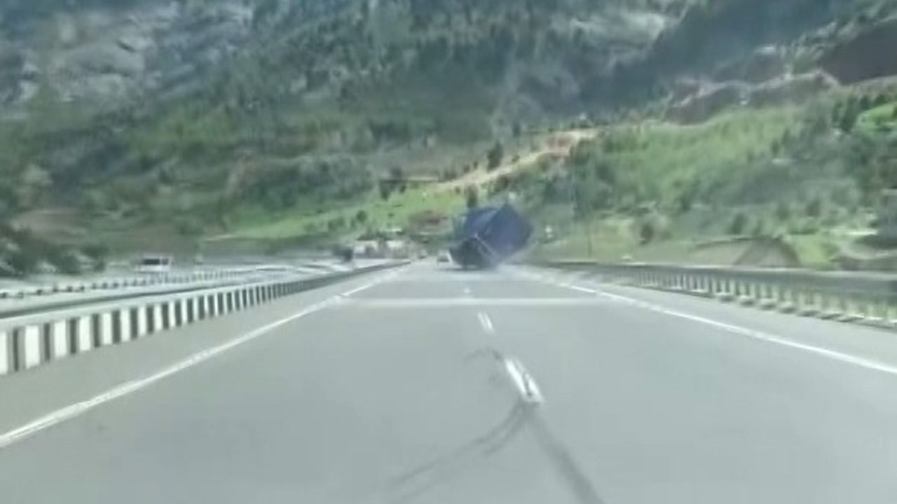 Kahramanmaraş’ta meydana gelen trafik kazasında tırın devrilme anı cep telefonu kamerasına yansıdı.