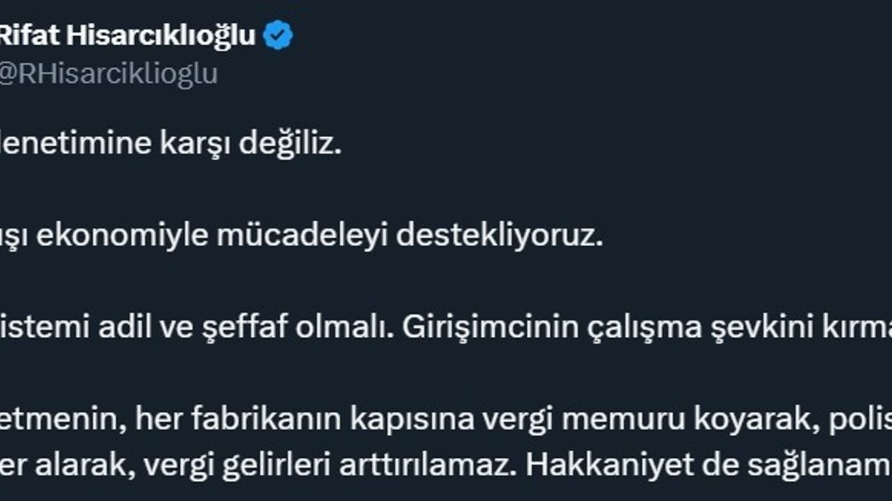 Sosyal medya hesabından vergi sistemine ilişkin açıklamalarda bulunan Hisarcıklıoğlu, "Vergi denetimine karşı değiliz. Kayıtdışı ekonomiyle mücadeleyi destekliyoruz. Vergi sistemi adil ve şeffaf olmalı. Girişimcinin çalışma şevkini kırmamalı. Her işletmenin, her fabrikanın kapısına vergi memuru koyarak, polisiye tedbirler alarak, vergi gelirleri arttırılamaz. Hakkaniyet de sağlanamaz" ifadelerini kullandı.