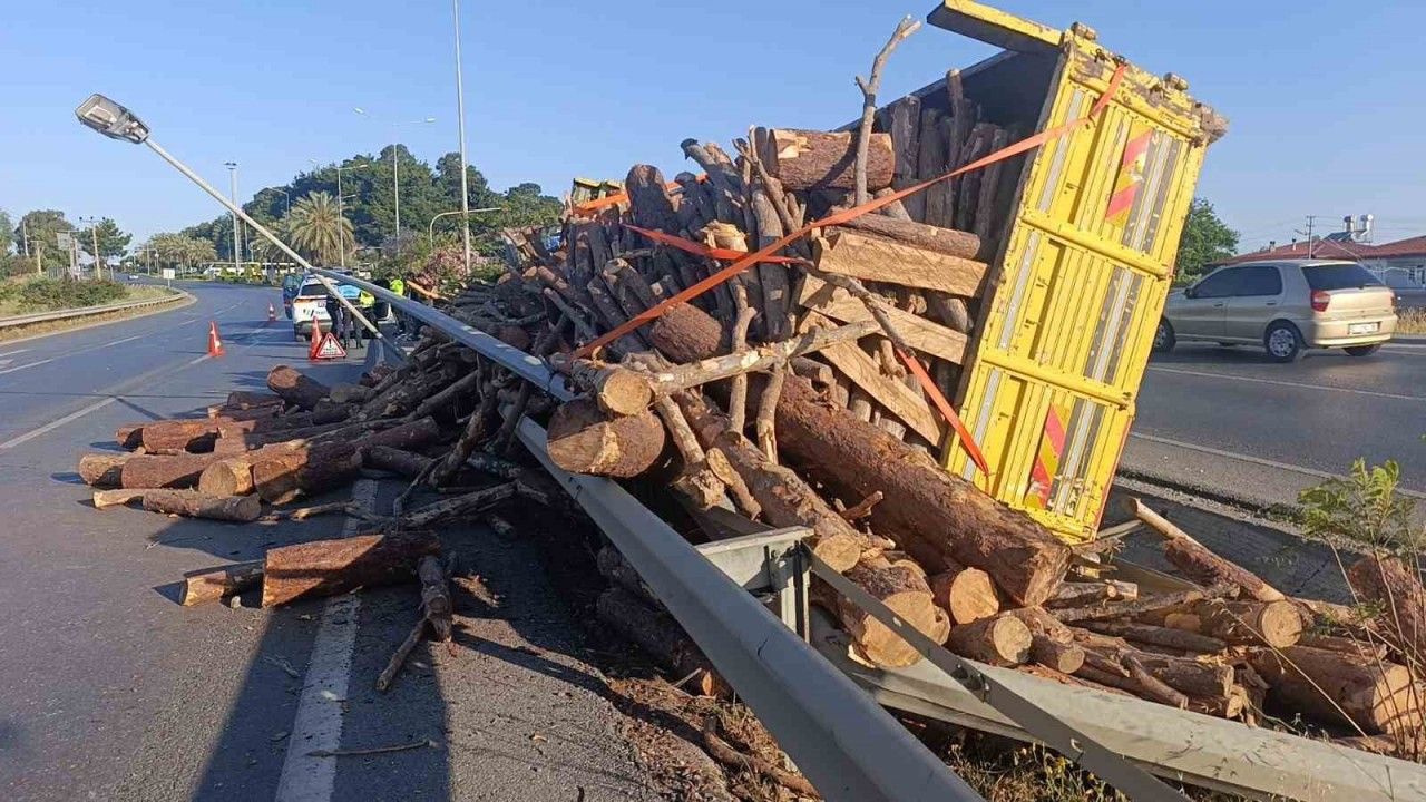 Antalya’nın Manavgat ilçesinde tomruk yüklü kamyonun bariyerleri aşıp refüje devrilmesi sonucu meydana gelen kazada şans eseri yaralanan olmadı.