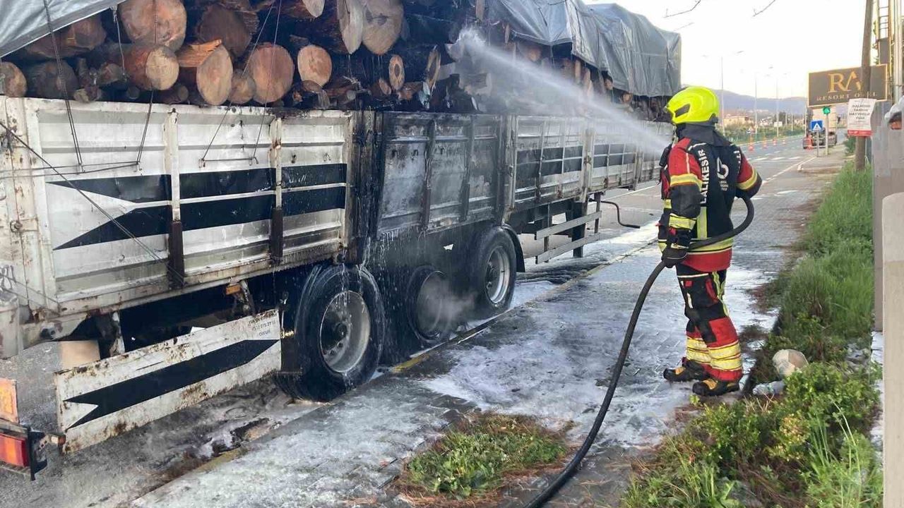 Balıkesir'in Edremit ilçesinde seyir halindeki tomruk yüklü bir tırın dorsesinde çıkan yangın, itfaiye ekiplerinin müdahalesiyle söndürüldü. E-87 karayolu üzerinde meydana gelen olayda facianın eşiğinden dönüldü.