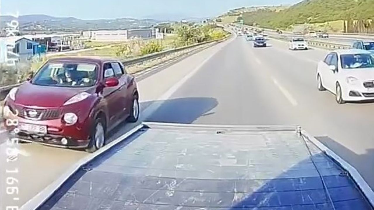 İzmir-İstanbul otobanında ilerleyen sürücüler, bazı bölgelerde yoğun bir trafikle karşılaştı. Bu yoğunluktan sıkılan sürücülerden biri, hızla akan trafiği tehlikeye düşürerek en soldan en sağ şeride zikzak çizerek geçti. Daha sonra emniyet şeridini de ihlal eden sürücü, önündeki çekici kamyonu da sağladı.