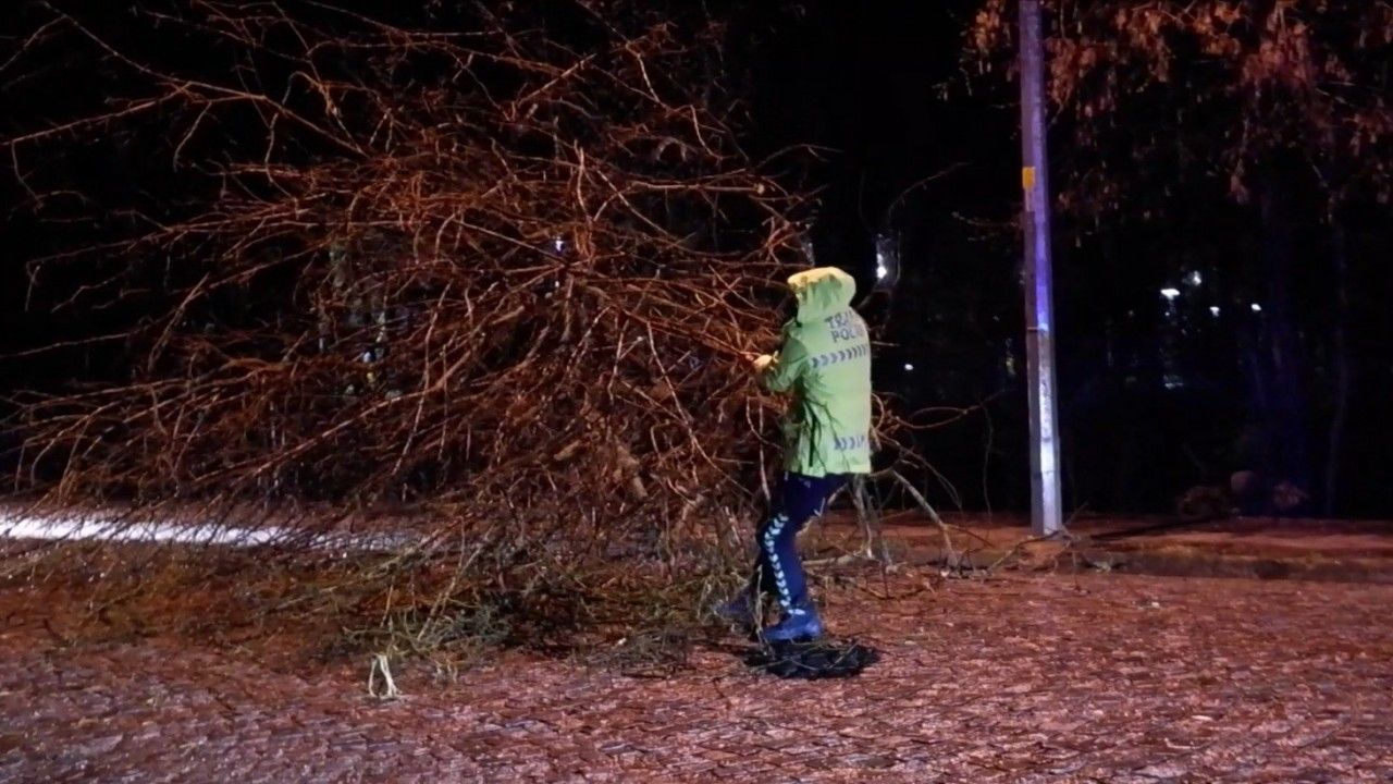 Edirne’de sağanak yağış sonrası yola devrilen ağacı kaldırmak için trafik polisleri seferber oldu.
