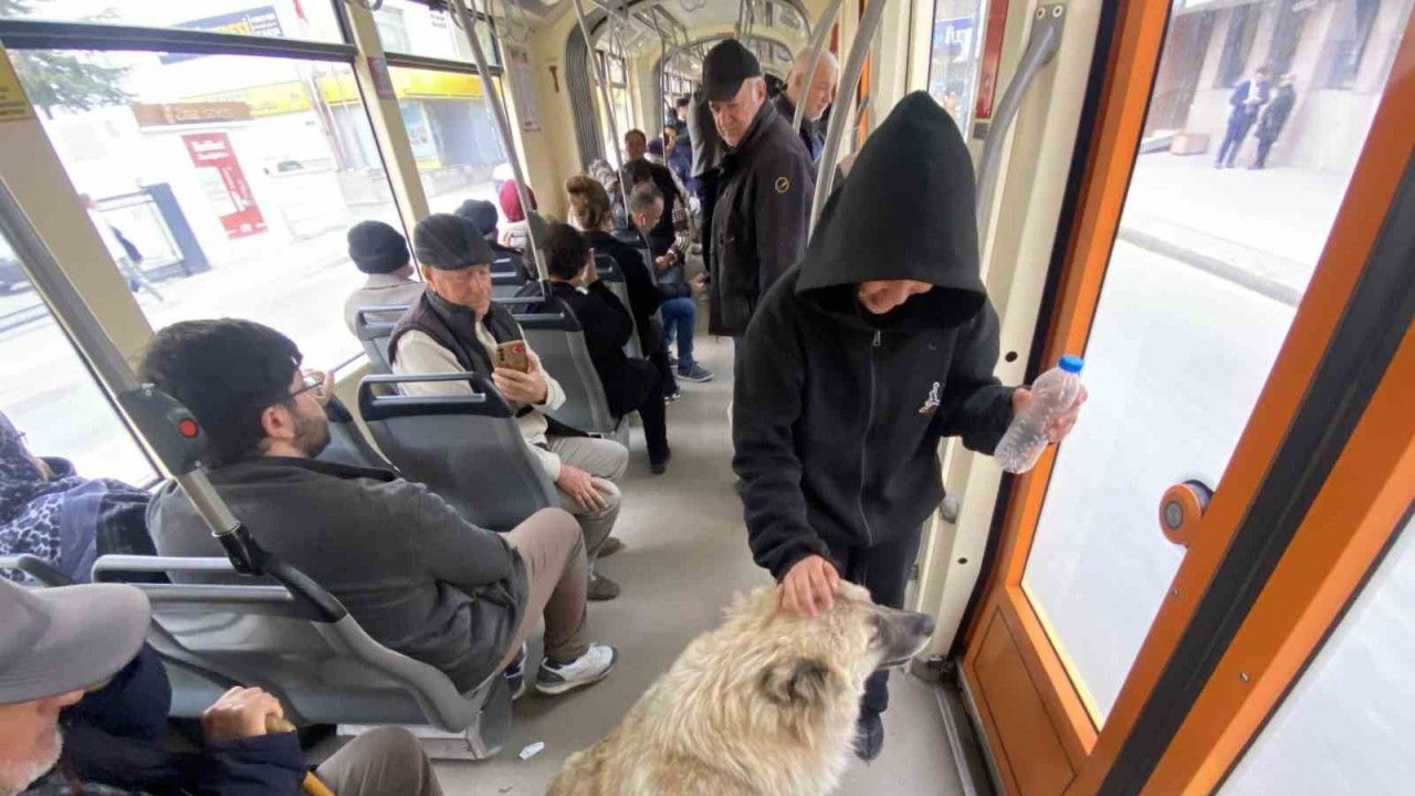 Eskişehir’de tramvaya binen köpek yolcuların ilgi odağı olurken, onu şefkatle seven küçük bir çocuk görenleri gülümsetti.