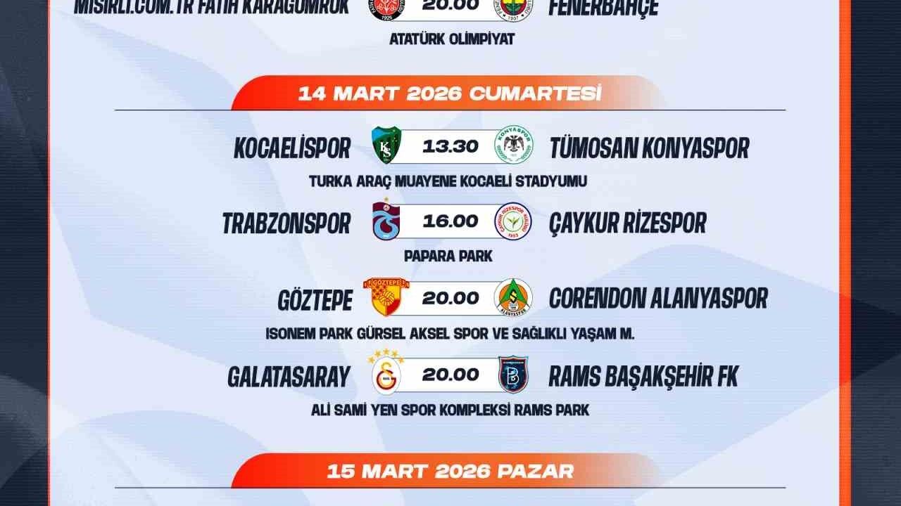 Türkiye Futbol Federasyonu (TFF), Süper Lig'de 26-27. hafta maçlarına ilişkin programı duyurdu. Galatasaray ve Samsunspor'un UEFA Şampiyonlar Ligi ve UEFA Konferans Ligi'nde son 16 turuna yükselmiş olmalarından dolayı, Göztepe - Galatasaray ile Çaykur Rizespor - Samsunspor mücadeleleri ileri bir tarihe ertelendi. Karşılaşmaların oynanacağı tarihler daha sonra ilan edilecektir.