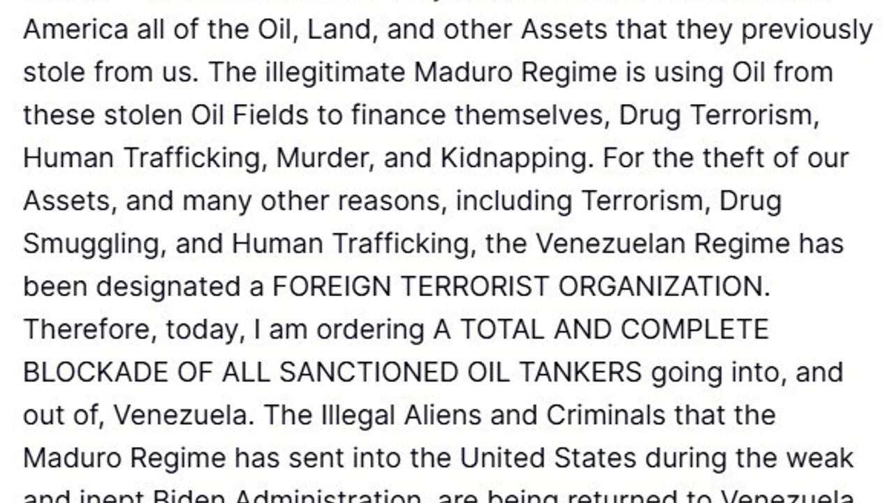 Nicolas Maduro rejiminin 'gayrimeşru' olduğunu ve çalınmış petrol sahalarından elde edilen petrolü uyuşturucu terörizmi, insan kaçakçılığı, cinayet ve adam kaçırma faaliyetlerini desteklemek için kullandığını savunan Trump, 'Varlıklarımızın çalınması başta olmak üzere, terörizm, uyuşturucu kaçakçılığı ve insan ticareti gibi pek çok gerekçe nedeniyle Venezuela rejimi, 'Yabancı Terör Örgütü' olarak tanımlanmıştır. Bu nedenle bugün, Venezuela'ya giren ve Venezuela'dan çıkan tüm yaptırıma tabi petrol tankerlerine tam ve kapsamlı bir abluka emri veriyorum' açıklamasında bulundu.