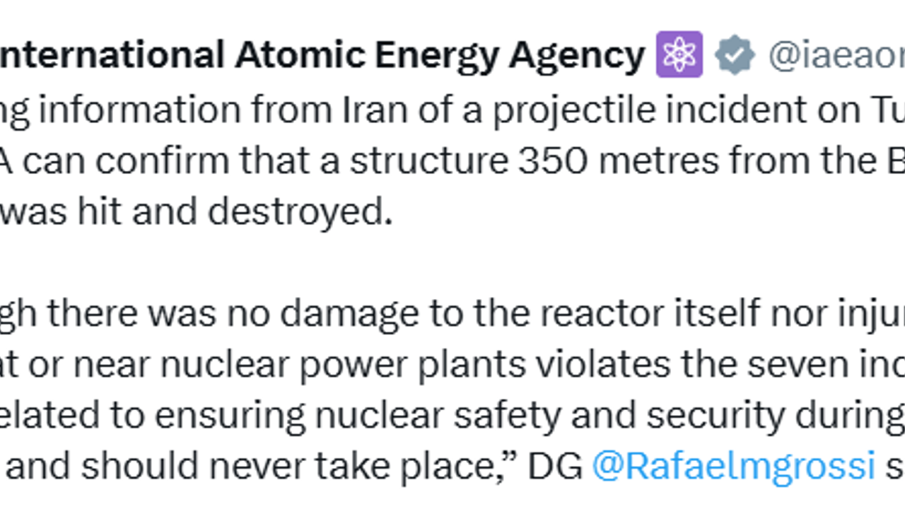 UAEA Başkanı Rafael Grossi, muhtemel güvenlik risklerine dikkat çekerek, 'Reaktörün kendisinde herhangi bir hasar olmamasına ve personelde yaralanma bildirilmemesine rağmen, nükleer santrallere veya yakınlarına yapılacak herhangi bir saldırı, silahlı bir çatışma sırasında nükleer güvenlik ve emniyetin sağlanmasıyla ilgili yedi temel ilkeyi ihlal eder ve asla gerçekleşmemelidir' uyarısında bulundu.