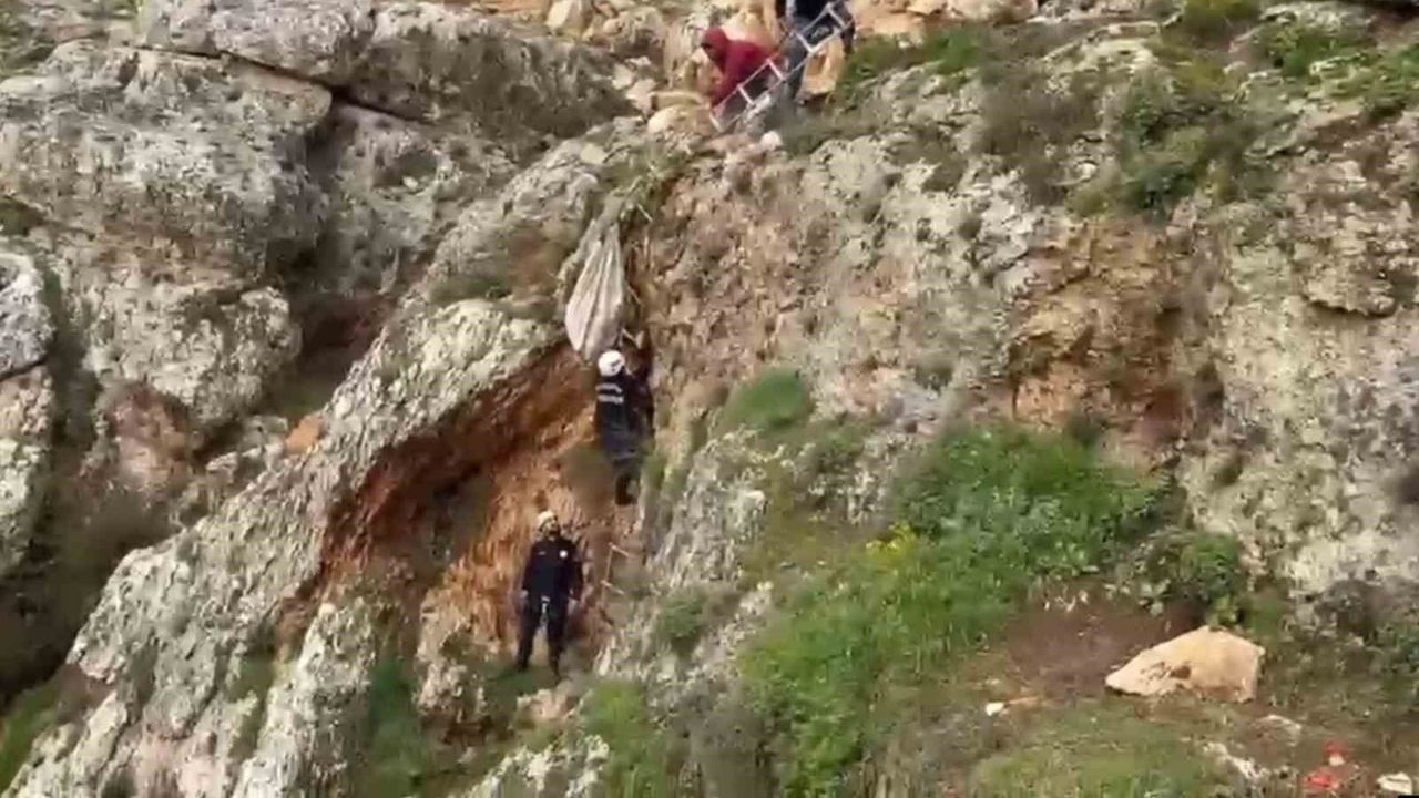 Şanlıurfa'da uçurumdan düşen köpek, itfaiye ekiplerinin 4 saatlik çalışması ile kurtarıldı.