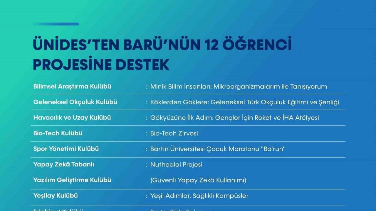 Bartın Üniversitesi (BARÜ) öğrenci kulüpleri Üniversite Öğrenci Toplulukları İş Birliği ve Destek Programı (ÜNİDES) kapsamında desteklenen 12 projeyle yeni bir başarı elde etti.