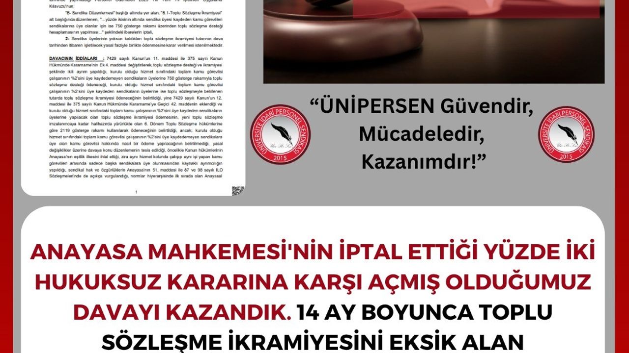Üniversite İdari Personel Sendikası (ÜNİPERSEN), Anayasa Mahkemesi’nin iptal ettiği yüzde 2 barajına ilişkin açtığı davayı kazandı. Karar doğrultusunda 14 ay boyunca toplu sözleşme ikramiyesini eksik alan kamu görevlilerine yasal faiziyle birlikte ödeme yapılacak.