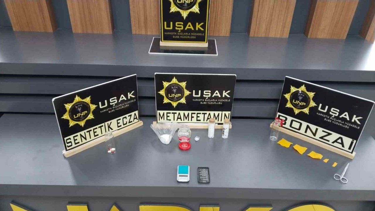 Uşak İl Emniyet Müdürlüğüne bağlı Narkotik Suçlarla Mücadele Şube Müdürlüğü ekipleri, merkeze bağlı Durak Mahallesi’nde bir eve operasyon düzenledi. Evde yapılan aramada 208 adet kullanımlık A4 bonzai, 34 gram metamfetamin, bir miktar sentetik ecza, 1 adet hassas terazi ve uyuşturucu madde satmaktan elde edildiği değerlendirilen 10 bin 400 TL ile 100 euro ele geçirildi. Operasyon kapsamında evde bulunan E.B., E.A. ve P.Ç. gözaltına alındı.