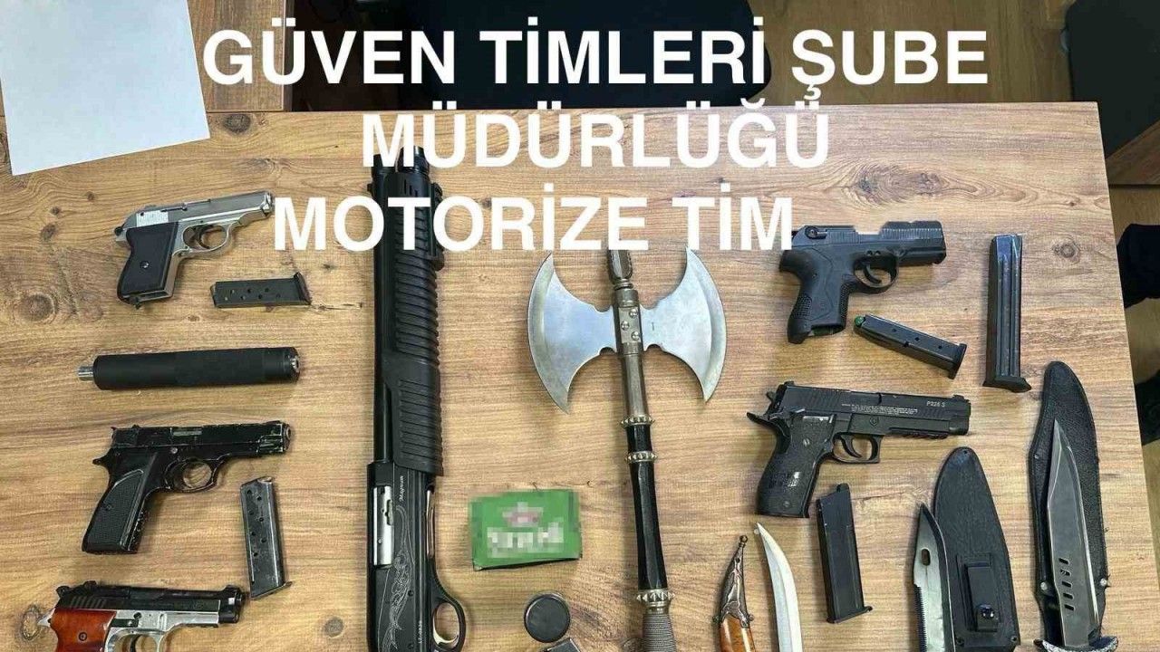 Yapılan aramalarda şüphelinin üzerinden 1 adet ruhsatsız tabanca ve 8 adet fişek ele geçirildi. Çalışmaların devamında şüpheli K.T.’nin ikamet adresinde yapılan aramalarda ise; 2 adet ruhsatsız tabanca, 2 adet kurusıkı tabanca ve bunlara takılı vaziyette 2 adet şarjör, 1 adet pompalı tüfek, 1 adet airsoft diye tabir edilen silah, 1 adet silah susturucu olarak değerlendirilen aparat, 2 adet bıçak ve 1 adet hançer, 1 adet balta, 126 adet çeşitli silahlara ait farklı çapta fişek, çok sayıda havalı tabanca fişeği, 1,8 gram narkotik madde ele geçirildi. Emniyette işlemleri biten şüpheli K.T uyuşturucu madde bulundurmak ve resmi belgede sahtecilik suçlarından sevk edildiği adli makamlarca tutuklanarak ceza evine gönderildi.