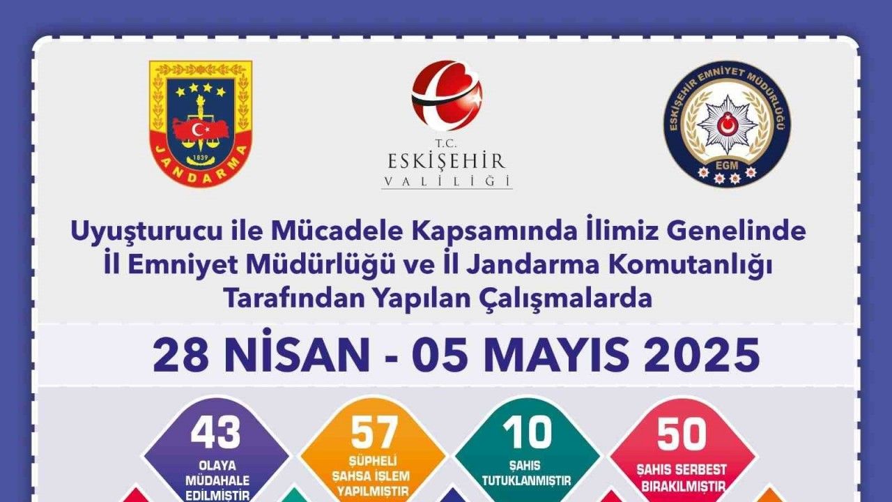 Edinilen bilgilere göre, İl Emniyet Müdürlüğü ve İl Jandarma Komutanlığı ekiplerinin uyuşturucu ile mücadele çalışmaları sürüyor. Bu çerçevede, kent genelinde 28 Nisan - 5 Mayıs tarihleri arasında çalışma yapıldı. Ekiplerin çalışmaları sonucunda 43 olaya müdahale edilirken, 57 şüpheliye işlem yapılıp, 10 şahıs tutuklandı ve 50 şahıs serbest bırakıldı. Ayrıca, 20,66 gram metamfetamin, 3 bin 768 adet sentetik ecza, 8,91 gram esrar, 1 adet uyuşturucu kullanma aparatı ve 64,91 gram bonzai maddesinin ele geçirildiği belirtildi.