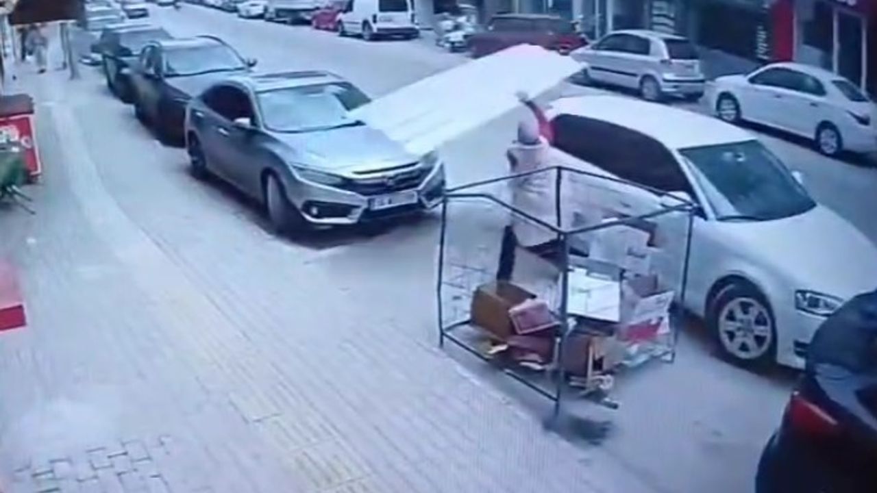 Bursa’nın Mustafakemalpaşa ilçesinde kısa süreli etkili olan rüzgar, Balıkesir Caddesi’nde tehlikeli anlara sahne oldu. Bir binadan kopan iki parça eternit çatı, yol üzerinden geçen bir kadını ıskalayarak park halindeki bir otomobilin yan kısmına zarar verdi. Olay anı çevredeki iş yerlerinin güvenlik kameralarına yansıdı. Görüntülerde kaldırımda yürüyen kadının, düşen çatı parçalarını son anda fark ederek kenara çekildiği ve büyük bir tehlikeyi ucuz atlattığı görülüyor.