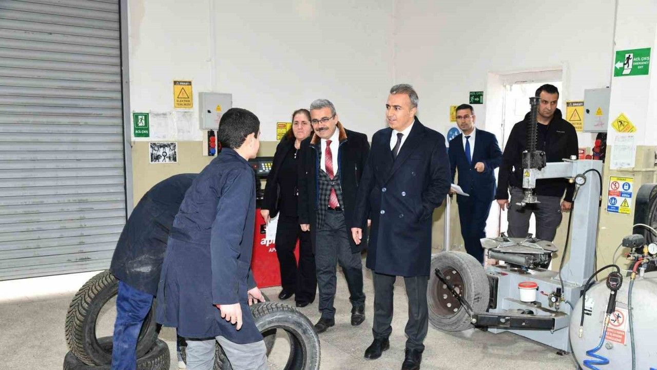 Okulun farklı atölyelerini gezerek öğrencilerin çalışmalarını inceleyen Vali Çiçek, öğrencilerin geleceğe dair hedefleri üzerine sohbet etti ve başarı dileklerinde bulundu. Atölyelerde yürütülen çalışmalar hakkında öğretmenlerden bilgi alan Çiçek, mesleki ve teknik eğitimin gençlerin geleceği açısından büyük önem taşıdığını ifade etti.