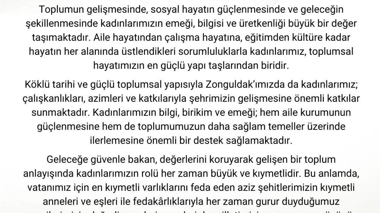Zonguldak özelinde kadınların azim ve çalışkanlığına değinen Vali Hacıbektaşoğlu, 'Köklü tarihi ve güçlü toplumsal yapısıyla Zonguldak'ımızda da kadınlarımız; çalışkanlıkları, azimleri ve katkılarıyla şehrimizin gelişmesine önemli katkılar sunmaktadır. Kadınlarımızın bilgi, birikim ve emeği; hem aile kurumunun güçlenmesine hem de toplumumuzun daha sağlam temeller üzerinde ilerlemesine önemli bir destek sağlamaktadır' dedi.