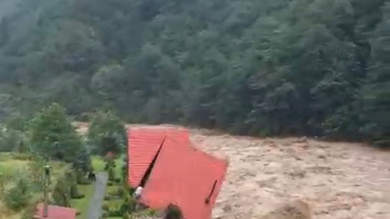 Rize’nin Çamlıhemşin ilçesinde etkili olan sağanak yağışın ardından dereler taştı. İlçede dere kenarında bulunan iki bungalov, şiddetli sel sularına dayanamayarak yıkıldı.