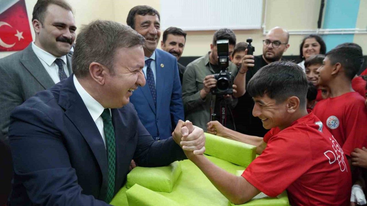 Otlukbeli ile Çayırlı Değer Erzincan Spor kulüplerinin açılışlarına katılan Vali Hamza Aydoğdu, genç sporcularla bilek güreşi tuttu.