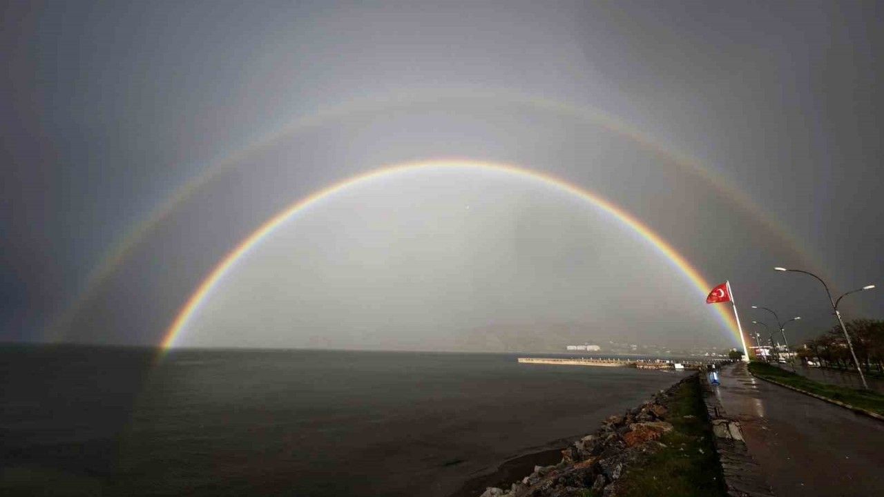 Van Gölü sahilinde ortaya çıkan bu doğa olayı, eşsiz manzarasıyla adeta görsel bir şölen sundu. Yağmurun ardından güneşin yeniden yüzünü göstermesiyle birlikte gökyüzünde oluşan çift gökkuşağı, Tatvanlılara unutulmaz anlar yaşattı. Tatvan sahilde gezen doğa fotoğrafçısı Oktay Subaşı, ortaya çıkan muhteşem manzarayı kaydetti.