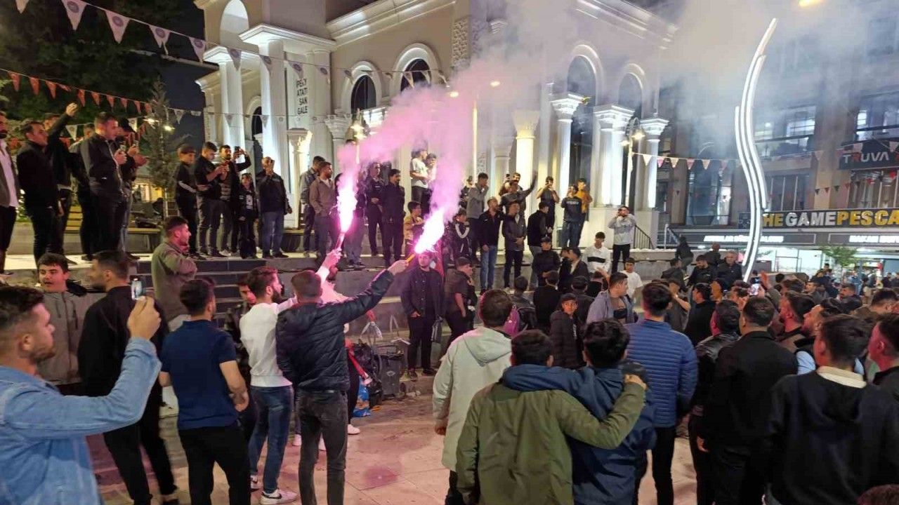 Kent meydanında kurulan dev ekrandan maçı takip eden yüzlerce taraftar, alınan 3-1’lik galibiyetin ardından büyük coşku yaşadı. Takımlarının attığı her golde sevinç çığlıkları atan taraftarlar, meşaleler yakarak meydanda kutlama yaptı.