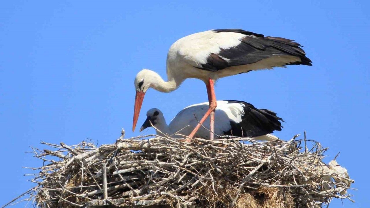 Yumurtadan çıkan yavrular ve onları besleme telaşı içinde yiyecek bulmak için kanatlanan anne ve baba leylekler, mahallede adeta bir görsel şölen oluşturuyor.