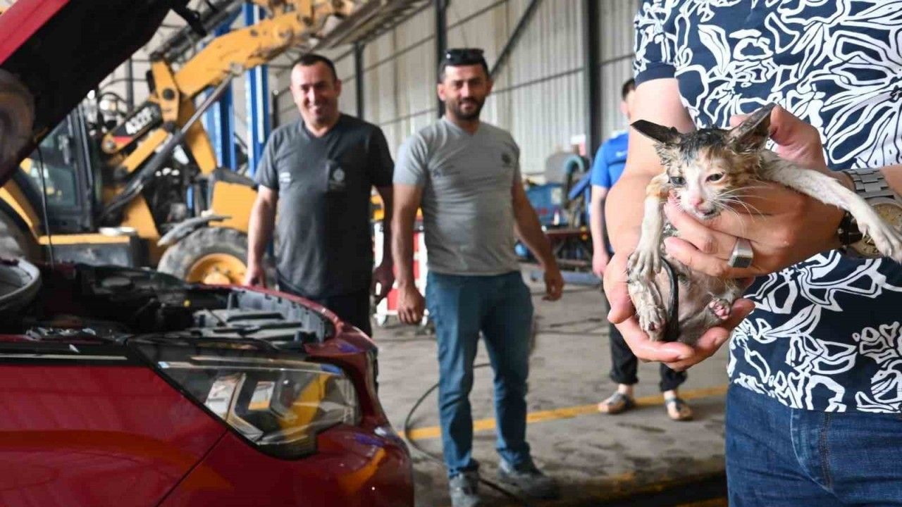 Başiskele’de bir otomobilin motor kısmına giren yavru kedi, uzun uğraşlar sonucu kurtarıldı.