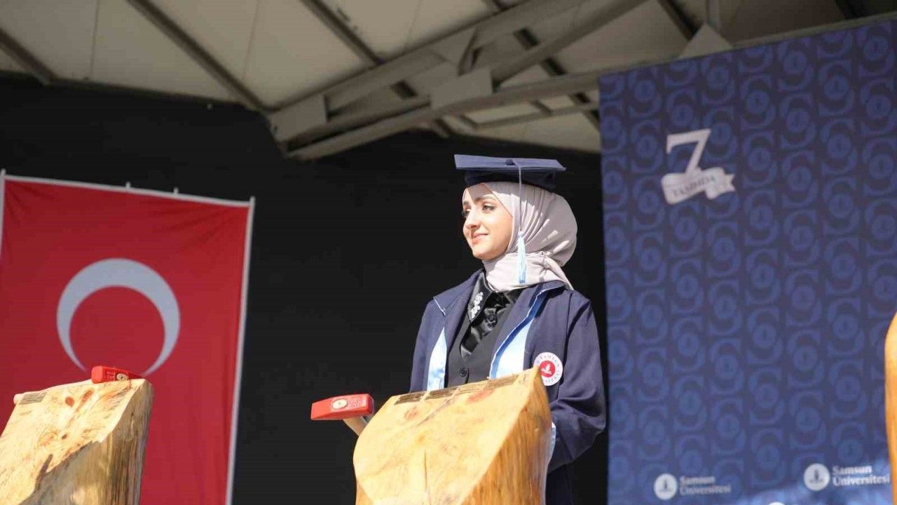 SAMÜ 2024-2025 Mezuniyet Töreni, Canik ilçesinde bulunan Doğupark Amfi Tiyatro’da velilerin yoğun katılımı ile yapıldı. 5 fakülte, 1 yüksekokul ve 1 meslek yüksekokuluna bağlı toplam 29 bölüm ve programdan 459 öğrenci mezuniyet sevinci yaşadı. Üniversite birincisi, fakülte birincisi, bölüm birincisi olan Yemenli Malak Gibreel Sadeq Suleiman Al-Aghbary törende yaptığı konuşmada, "Başarı sadece notlarla, projelerle, derecelerle ölçülmez. Gerçek başarı; yaşadığımız zorluklara rağmen yolumuza devam edebilmek, öğrendiklerimizi insanlığın ortak iyiliği için kullanabilmektir. Benim ait olduğum bölüm olan Biyomedikal Mühendisliği Bölümü’ndeki tüm değerli hocalarıma en içten teşekkürlerimi sunuyorum. Ayrıca Türkiye Cumhuriyeti ve Türk halkına kalpten teşekkür ediyorum. Yalnızca bana değil, umutla gelen herkese kapılarınızı açtınız. Bu ülke bana yalnızca bir eğitim değil, ikinci bir yuva verdi" dedi.