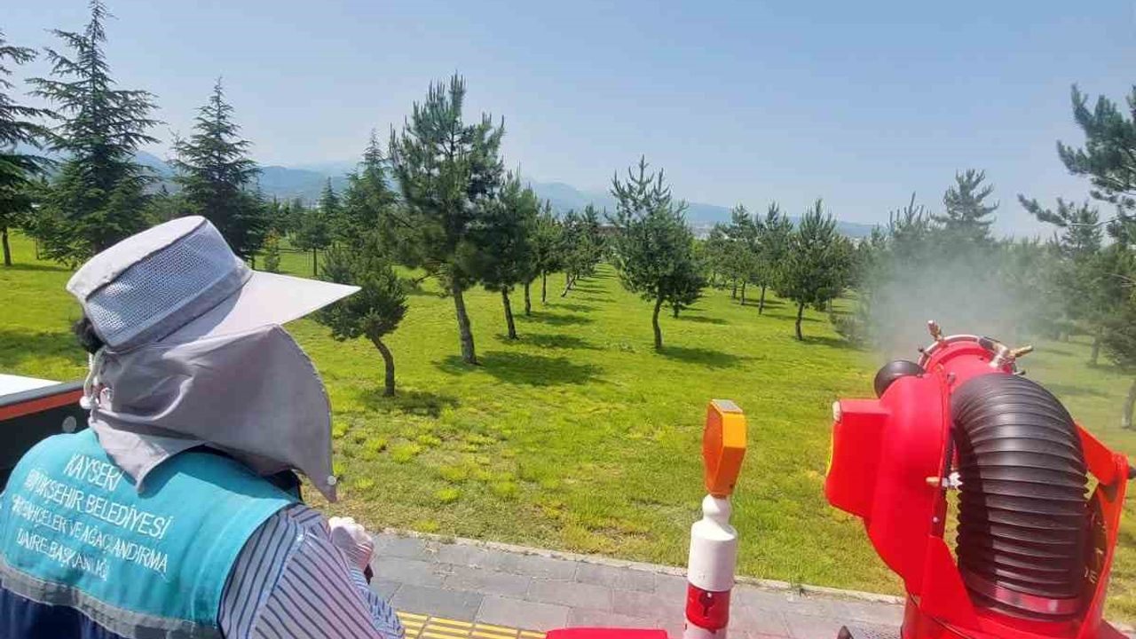Kayseri Büyükşehir Belediyesi; park, bahçe ve mesire alanı gibi sorumluluk sahasında bulunan tüm yeşil alanlarda hastalık ve zararlılara karşı ilaçlama çalışmalarını titizlikle yürütüyor.