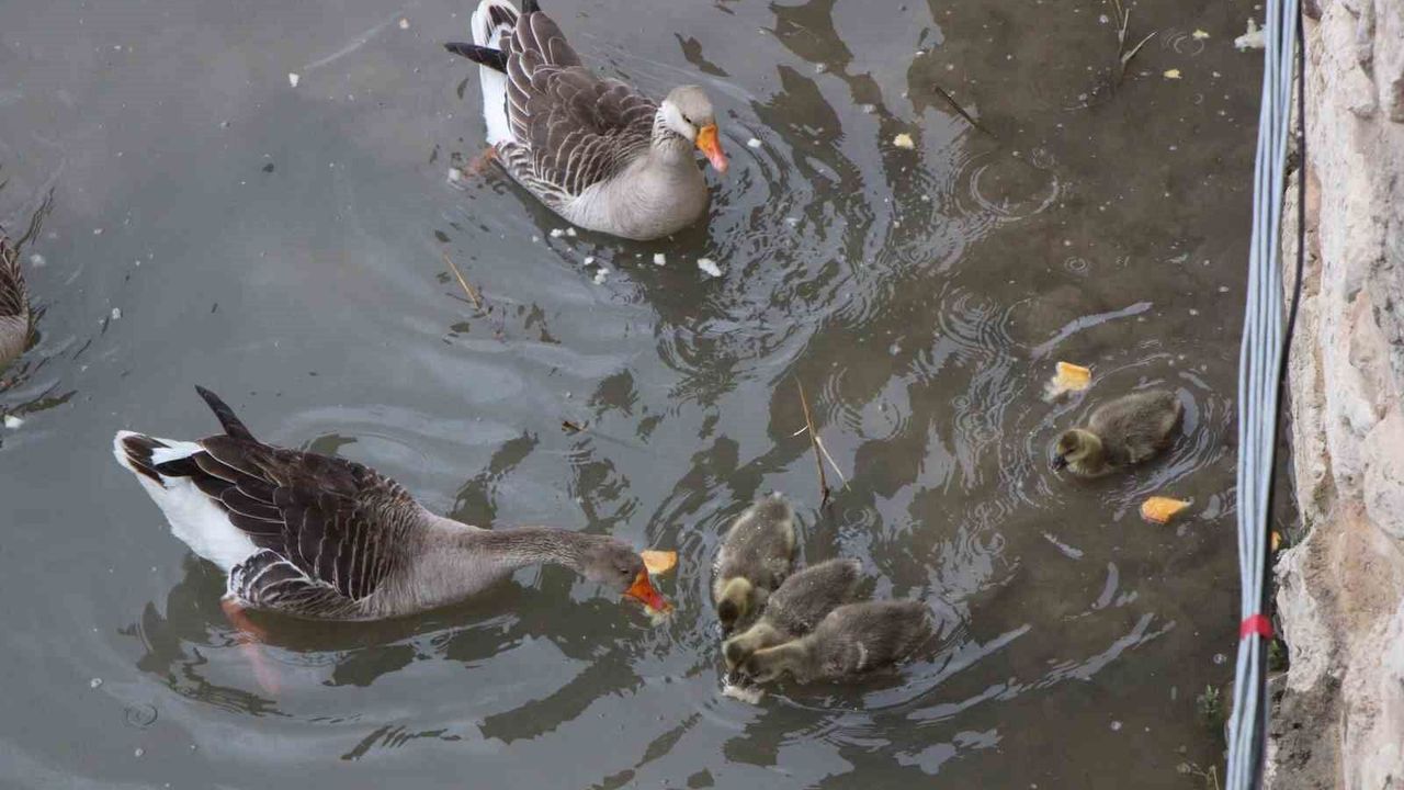 Amasya'da 4 küçük kaz yavrusu Yeşilırmak Nehri'nin maskotu oldu. Sevimli kazlar beslenme saatlerini aksatmıyor.
