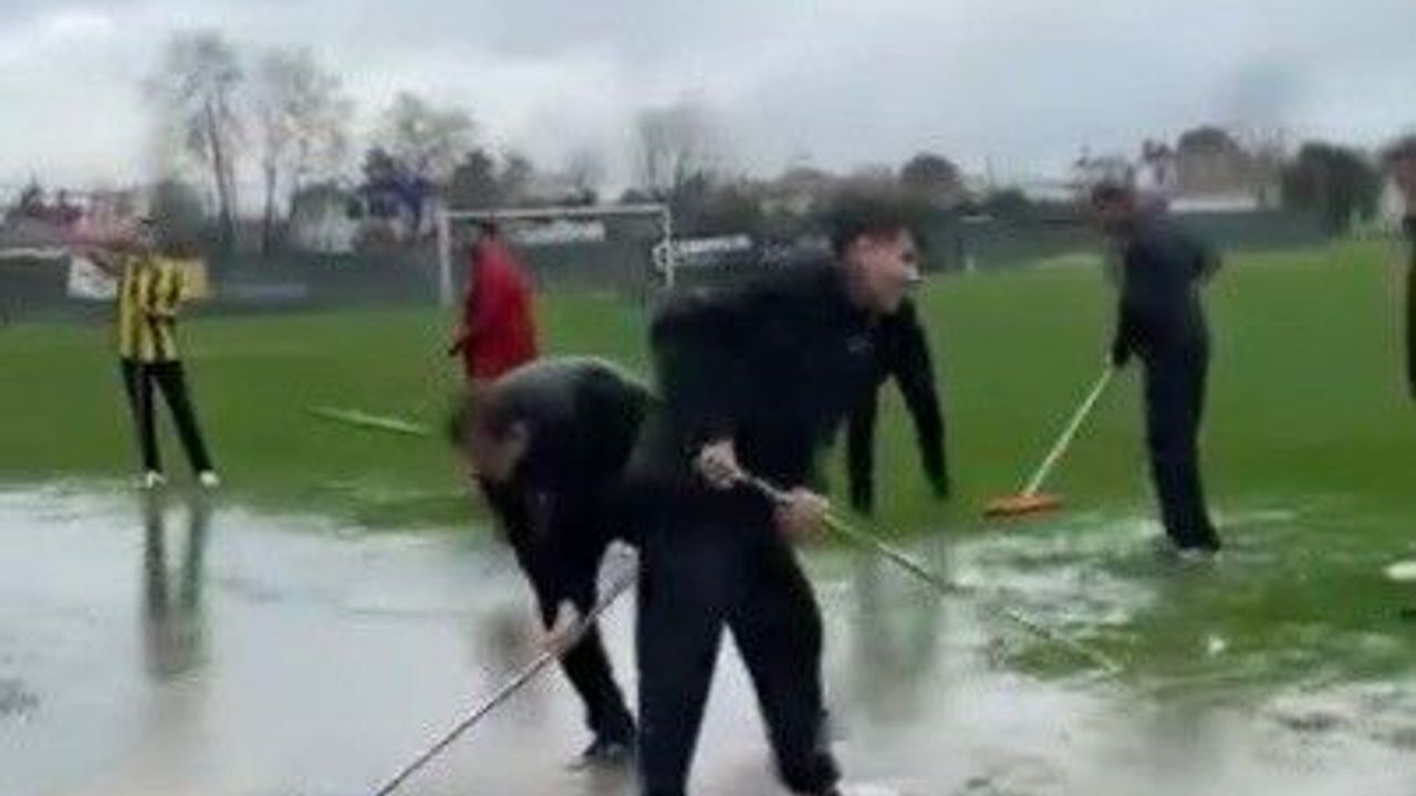 Türkiye Futbol Federasyonu (TFF) 3. Lig 2. Grup'un 25. haftasında oynanan Osmaniyespor FK-Ağrı 1970 Spor karşılaşması öncesinde, yoğun yağış nedeniyle sahada oluşan su birikintilerini taraftar ve görevliler temizledi.