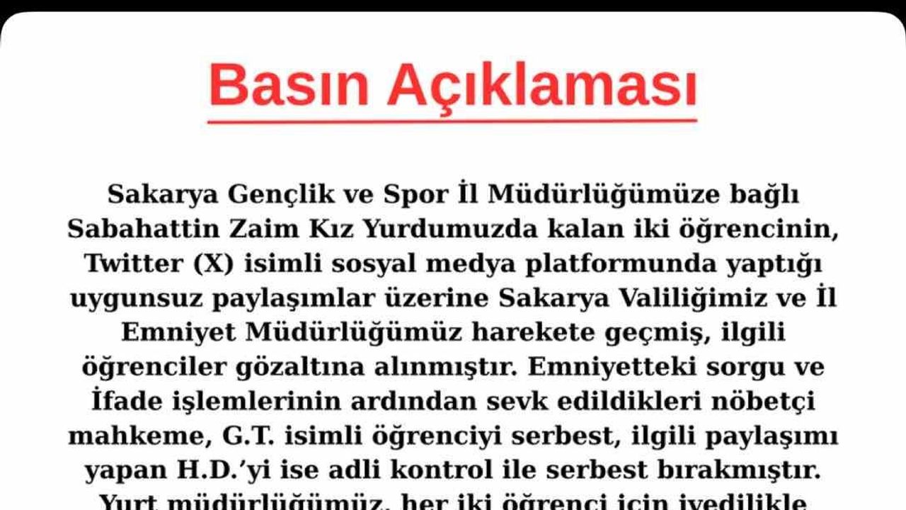 Öte yandan Gençlik ve Spor İl Müdürlüğü, kızların soruşturma süresi boyunca yurttan uzaklaştırıldığını duyurdu. Yapılan paylaşımda, "Sakarya Gençlik ve Spor İl Müdürlüğümüze bağlı Sabahattin Zaim Kız Yurdumuzda kalan iki öğrencinin sosyal medya platformunda yaptığı uygunsuz paylaşımlar üzerine Sakarya Valiliğimiz ve İl Emniyet Müdürlüğümüz harekete geçmiş, ilgili öğrenciler gözaltına alınmıştır. Emniyetteki sorgu ve ifade işlemlerinin ardından sevk edildikleri nöbetçi mahkeme, G.T. isimli öğrenciyi serbest, ilgili paylaşımı yapan H.D.’yi ise adli kontrolle serbest bırakmıştır. Yurt müdürlüğümüz, her iki öğrenci için ivedilikle disiplin soruşturması başlatmış ve Yurt Hizmetleri Yönetmeliği’nin 24/3 maddesine göre de öğrencilere soruşturma süreci boyunca yurttan uzaklaştırma cezası verilmiştir" ifadeleri yer aldı.