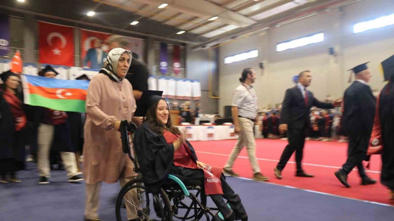 Anadolu Üniversitesi’nde 2024-2025 Akademik Yılı, Açıköğretim Sistemi, Çocuk Üniversitesi ve Tazelenme Üniversitesinin, mezuniyet töreni Yunus Emre Kampüsü içerisinde bulunan spor salonunda düzenlendi. Doğuştan omurilik felçli ve yüzde 90 engelli olan, Zonguldak’ın Çaycuma ilçesinde yaşayan 22 yaşındaki Tuana Akar Açıköğretim Fakültesi Sosyal Hizmetler Bölümünü bitirerek mezuniyet coşkusu yaşadı.