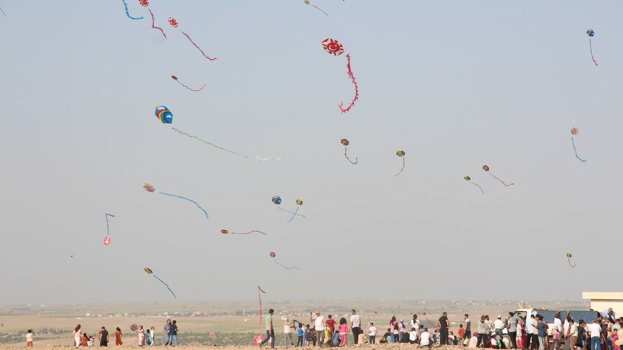 Suriye sınırında yer alan Şanlıurfa’nın Ceylanpınar ilçesinde bir araya gelen yüzlerce aile, uçurtma uçurarak gökyüzünde renkli görüntüler oluşturdu.