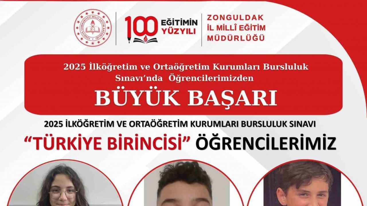 Zonguldak Merkez Gazi Mustafa Kemal Ortaokulu 5. sınıf öğrencisi Hüseyin Can Ateş, Çaycuma Mimar Sinan Ortaokulu 6. sınıf öğrencisi Ahmet Arif Özdemir ve Devrek Atatürk Ortaokulu 5. sınıf öğrencisi Derin Özlen, 2025 yılı Bursluluk Sınavı’nda 500 tam puan alarak Türkiye genelinde birincilik elde etti.